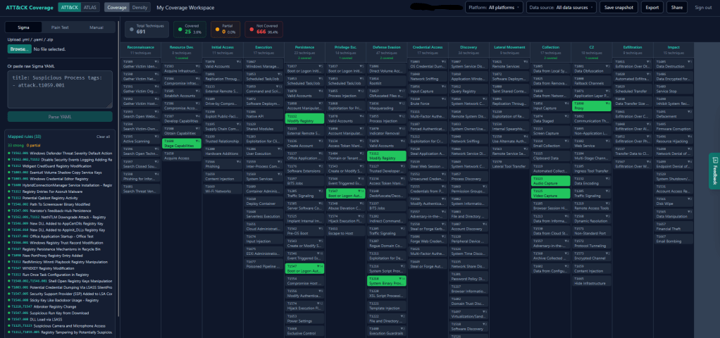 Most coverage tools focus on ATT&CK Enterprise and treat MITRE ATLAS (the adversarial AI/ML threat matrix) as an afterthought. This tool handles both in the same workspace. If you’re running ML models in your environment, which most cloud-heavy organisations are understanding your ATLAS coverage is increasingly relevant. You upload your rules once and check both frameworks without switching tools.